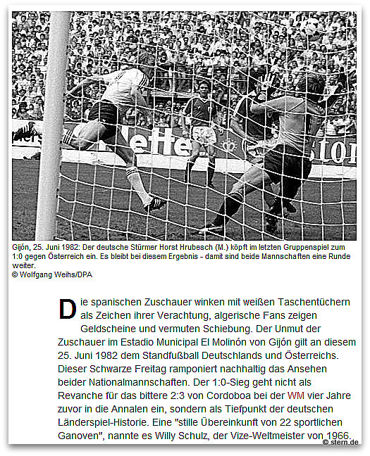 Die Erinnerung an die Schande von Gijón heute vor 32 Jahren wird gerade im Ausblick auf das morgige Spiel Deutschland - USA, wo beiden Mannschaften ein Punkt zum Weiterkommen reicht, wieder wach. Das möchte kein deutscher Fussballfan jemals wieder erleben. Die geschädigte Mannschaft bei der WM 1982 war Algerien, die wg. der Schande von Gijón nach Hause fahren mußte. Möglicher Achtelfinalgegner der deutschen Mannschaft bei der WM in Brasilien ist übrigens ... Algerien ...