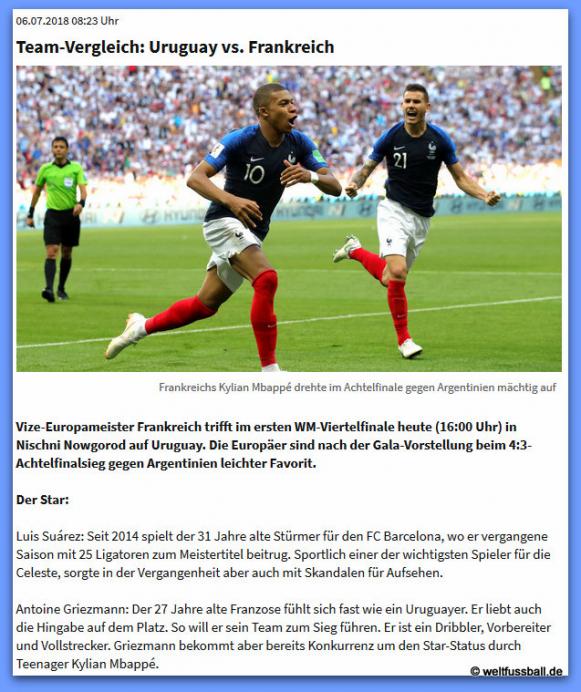 6. Juli 2018, 16.00 Uhr: WM Viertelfinale Uruguay - Frankreich 0:2