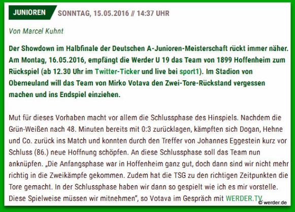 16. Mai 2016, 12.30 Uhr:: U19 Halbfinale SV Werder Bremen - TSG Hoffenheim