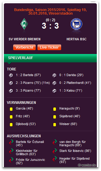 Samstag, 30.01., 15.30 Uhr: SV Werder Bremen - Hertha BSC Berlin 3:3