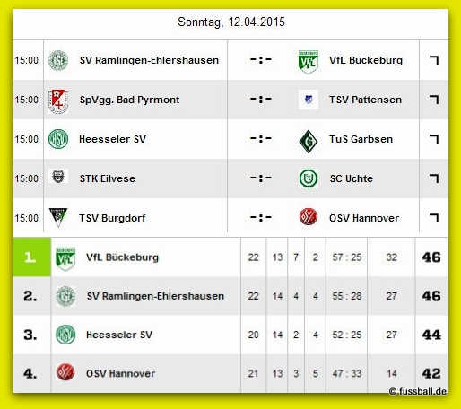 Der Kampf um den Titel findet am Sonntag in der Stadt Burgdorf statt. Der Tabellenzweite Ramlingen-Ehlershausen empfängt den punktgleichen Tabellenführer aus Bückeburg. Nur 2 Punkte dahinter aber mit 2 Spielen weniger lauert der Heesseler SV, der zu Hause auf den TUS Garbsen trifft. Wiederum 2 Punkte dahinter hofft der OSV Hannover auf Ausrutscher der ersten Drei. Die Hannoveraner spielen ebenfalls in Burgdorf, und zwar beim TSV. Hoffentlich behalten die Burgdorfer bei dieser Anhäufung von Spitzenspielen in der Stadt auch noch den Überblick.