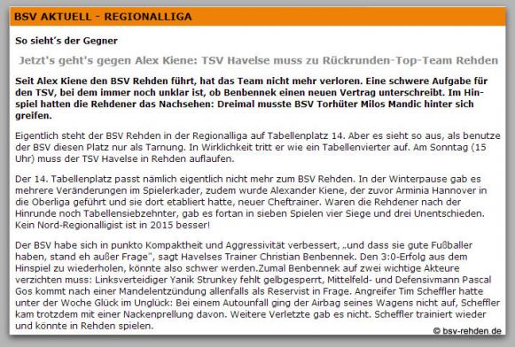 Sonntag, 15.00 Uhr: RL Nord BSV Rehden - TSV Havelse 2:0