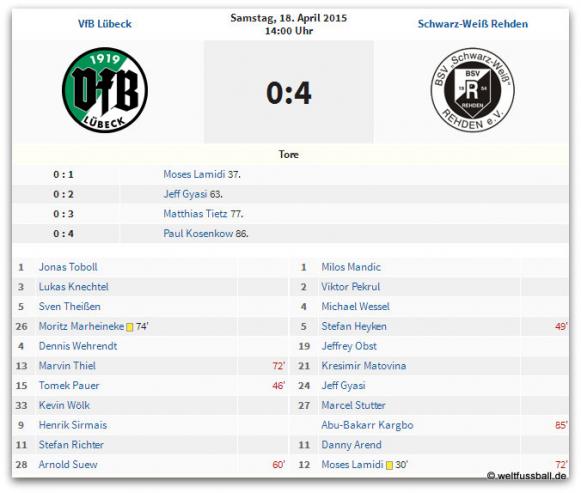 Samstag, 14.00 Uhr: RL Nord VfB Lübeck - BSV Rehden 0:4