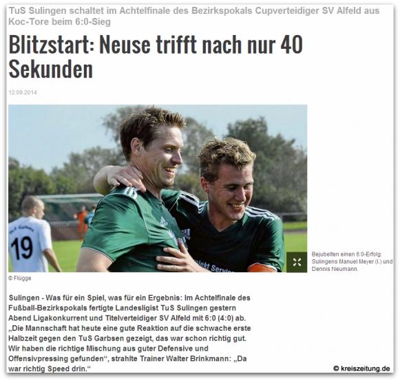 Donnerstag, 20.00 Uhr: TUS Sulingen - SV Alfeld 6:0 Bezirkspokal