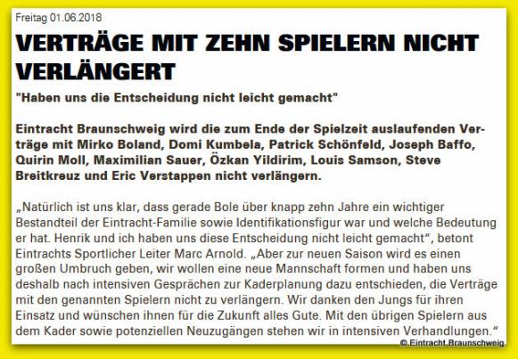1. Juni 2018: Eintracht Braunschweig - Verträge mit 10 Spielern nicht verlängert