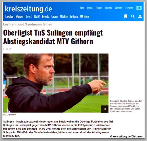 Sonntag, 3. Dezember, 14.00 Uhr: TUS Sulingen - MTV Gifhorn --- Spiel fällt aus !!!