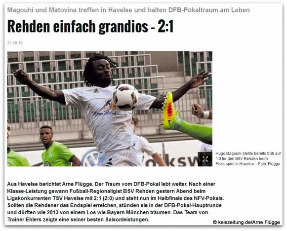 Der DFB-Pokaltraum lebt weiter. Der BSV Rehden " rächt " den benachbarten TUS Sulingen, der im Achtelfinale nach großem Kampf mit 3:4 gegen den TSV Havelse unterlag und siegt im Viertelfinale in Havelse mit 2:1. Nun fehlt nur noch ein Sieg für den BSV Rehden zum Einzug ins Finale des NFV Pokals und damit in die 1. Hauptrunde des DFB Pokals. Die möglichen Gegner im Halbfinale sind Arminia Hannover aus der Oberliga Niedersachsen, Regionalligist Lüneburger SK sowie Drittligist VfL Osnabrück. Viel Glück BSV Schwarz-Weiß Rehden !!!