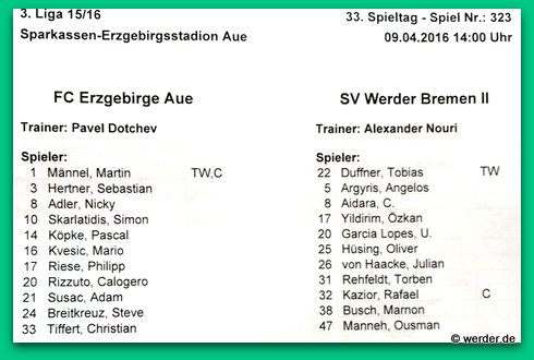 9. April, 14.00 Uhr: 3. Liga Erzgebirge Aue - SV Werder Bremen II 1:0