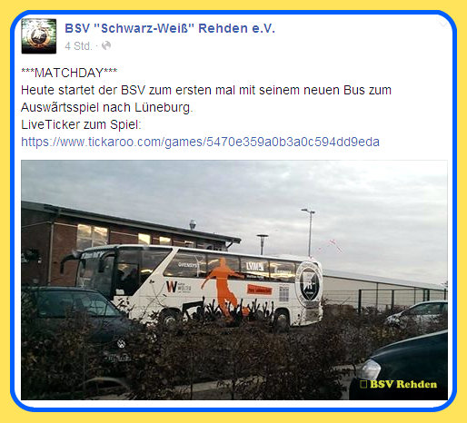 BSV Rehden im neuen Bus zum Auswärtsspiel in Lüneburg. Vielleicht bringt er Glück und dringend benötigte 3 Punkte für den BSV. Tore: 0:1 (45.) Jeffrey Obst 1:1 (89.) Hedon Selishta
