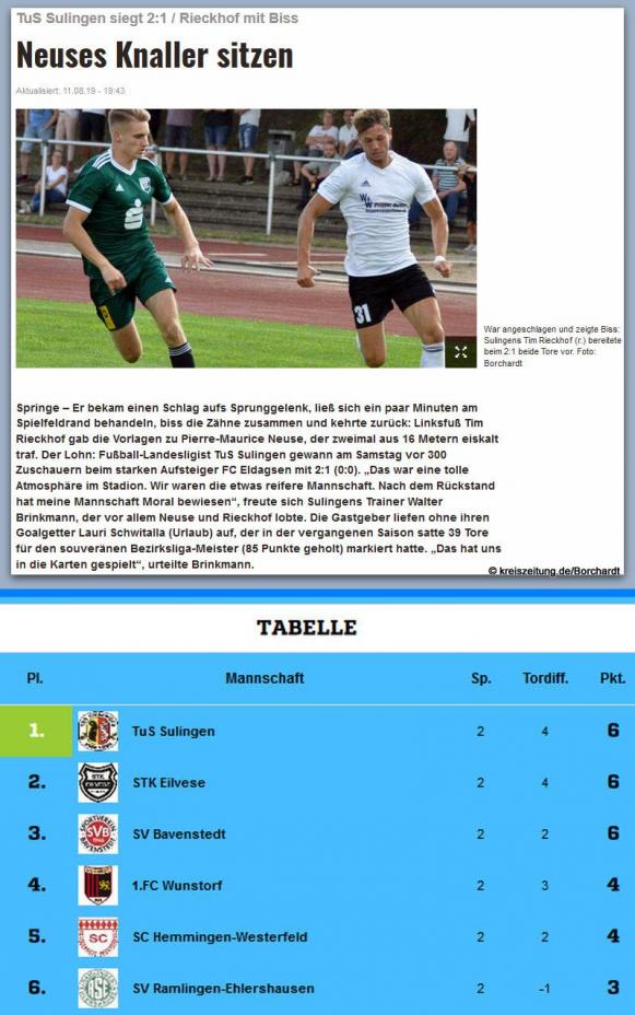 Samstag, 10. August, 16.00 Uhr: FC Eldagsen - TUS Sulingen 1:2