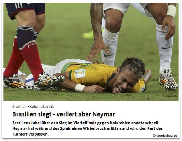 Brasilien steht im Halbfinale, verliert aber Superstar Neymar nach Foulspiel durch Wirbelbruch. Das ist bitter und sehr schmerzhaft. Gute Besserung. Am Dienstag spielen aber auf jeden Fall 11 gegen 11. Möge der bessere gewinnen.