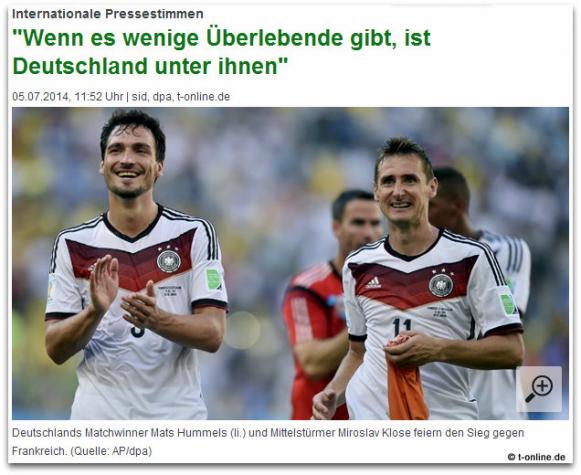 Fussball ist ein Ballspiel wo 11 Männer gegen andere 11 Männer einem Ball hinterherlaufen und am Ende immer die Deutschen gewinnen. So war es und so wird es immer bleiben. Nächster Termin: Dienstag, 8. Juli 2014: WM Halbfinale Brasilien - Deutschland.