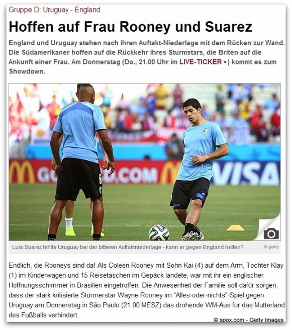 Es kam , wie es kommen mußte. Kaum von seiner Verletzung genesen schickt der Torschützenkönig der Premier League und Englands Fussballer des Jahres Luis Suarez " seine " Engländer mit 2 Toren zu 99% nach Hause. England hat nun nur noch eine Minichance aufs Weiterkommen. Falls Italien heute nicht gegen Costa Rica gewinnt, kann die Heimreise von den Engländern schon gebucht werden.