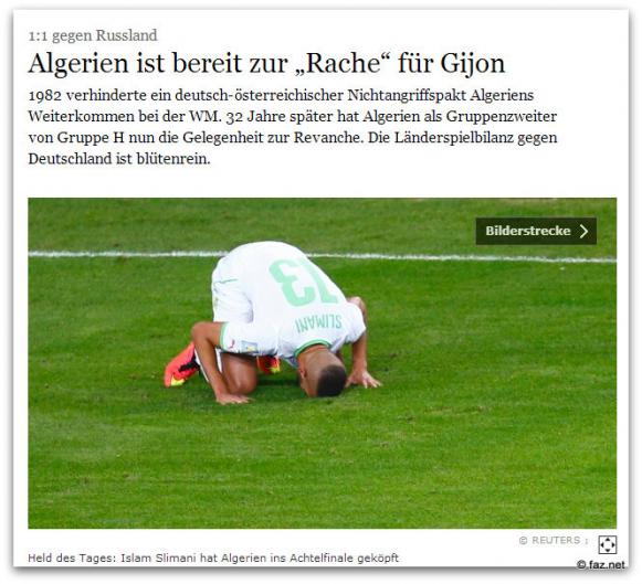 Am 25. Juni 1982 verhinderte ein Nichtangriffspakt von Deutschland gegen Österreich das Weiterkommen von Algerien ins Viertelfinale der Fussball - WM in Spanien. 32 Jahre später kommt es nun im Achtefinale der Fussball WM in Brasilien in Porto Alegre zur " Rache für Gijon ". Möge der bessere gewinnen.