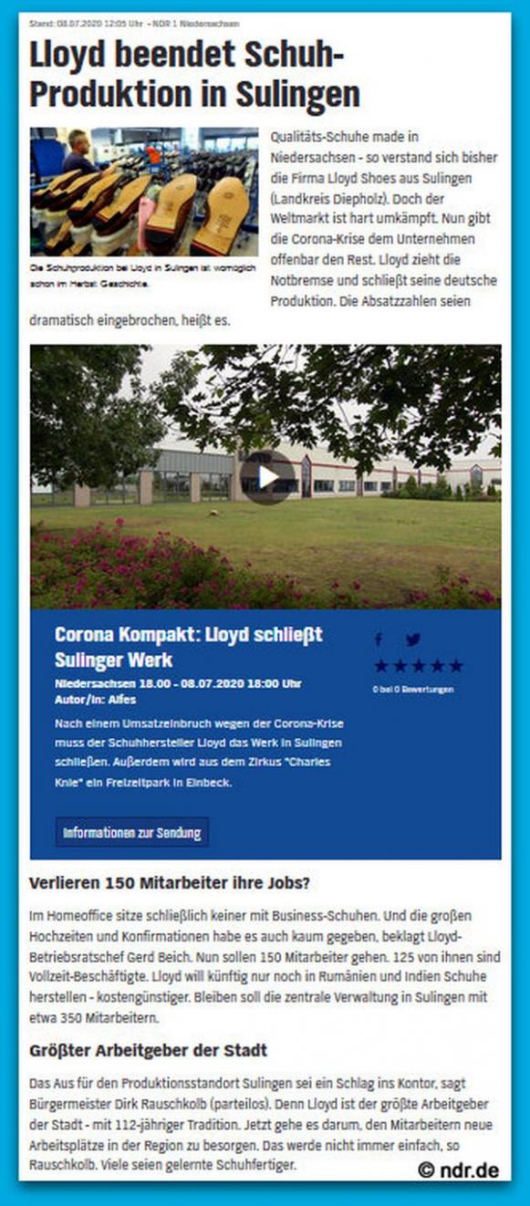 8. Juli 2020: Lloyd Shoes beendet Schuhproduktion in Sulingen