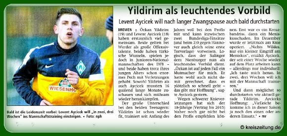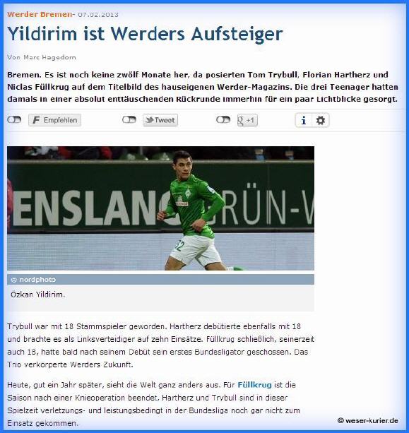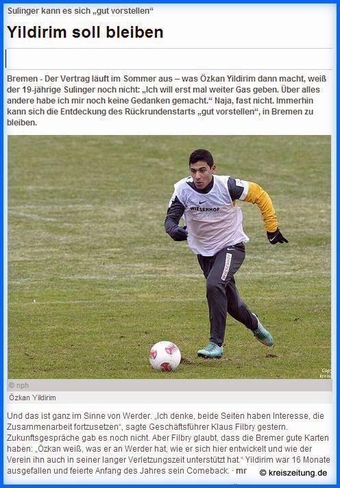 Zum Bericht der Kreiszeitung klick auf die Grafik Der Vertrag von Özkan Yildirim bei Werder Bremen läuft am 30. Juni 2013 aus. Aber momentan konzentriert sich Özkan nach der langen Verletzungspause voll auf das Sportliche. Er will endlich zeigen, was er drauf hat.