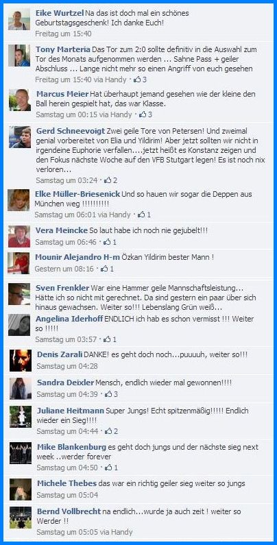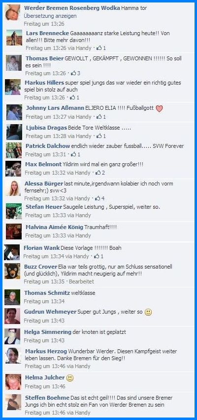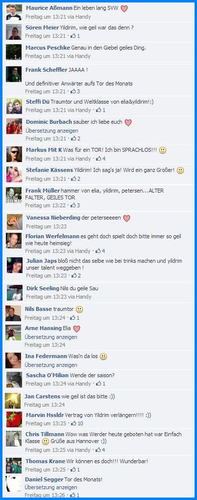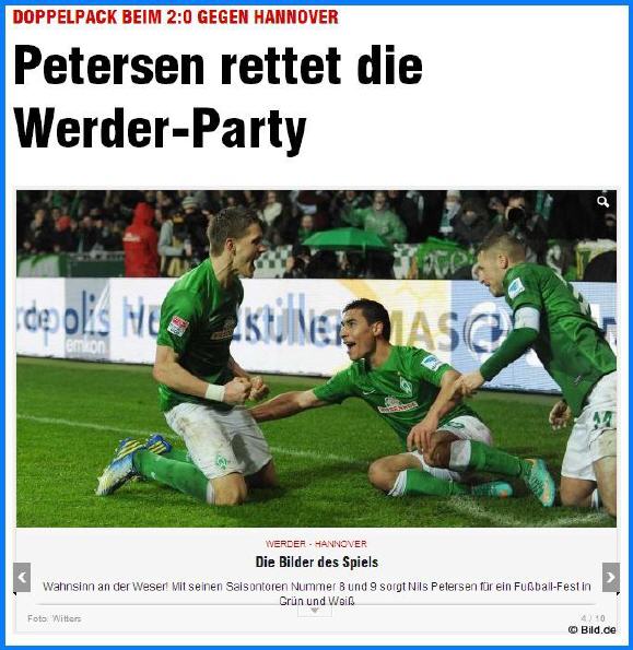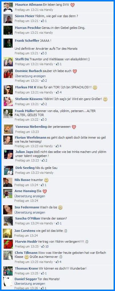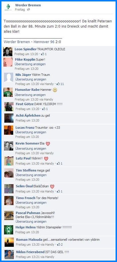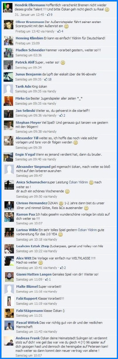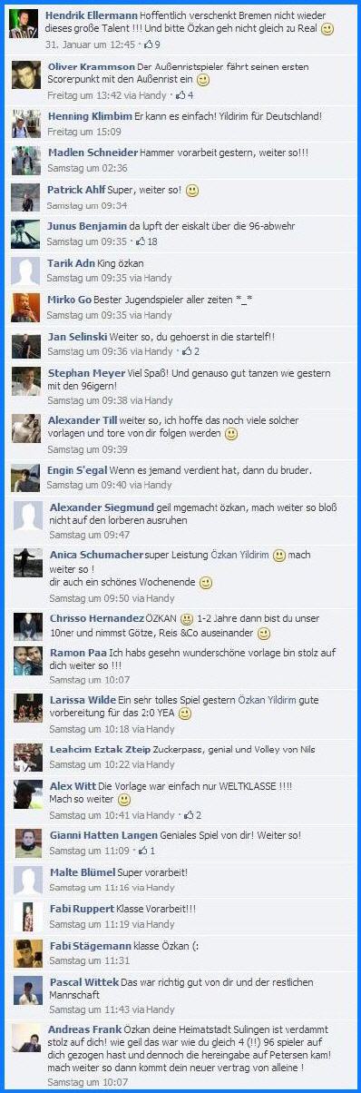 Zum Kreiszeitung-Bericht auf die Grafik klicken Özkan kam in der 74. Spielminute beim Stande von 2:3 für Zlatko Junuzovic. Kaum im Spiel setzte Nils Petersen den Ball an den Pfosten. Was wäre gewesen wenn ... So blieb es bis zum Ende nach turbulenter 2. Halbzeit beim 2:3. Özkan machte in der kurzen Zeit ein gutes Spiel. Überragende Technik und großes Spielverständnis waren auch diesmal sofort zu erkennen. Vielleicht gibts dann ja bald mal ein paar Einsatzminuten mehr. Würde dem Bremer Spiel vielleicht ganz gut tun. Nächste Woche gehts zum großen FC Bayern. Dort dabei zu sein, wäre eine weitere Traumerfüllung in der noch jungen Karriere des Özkan Yildirim.