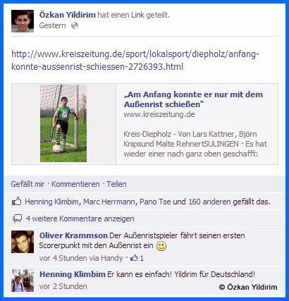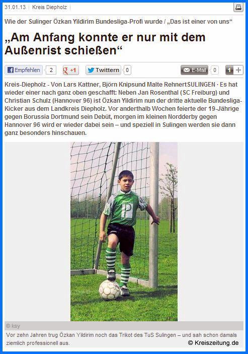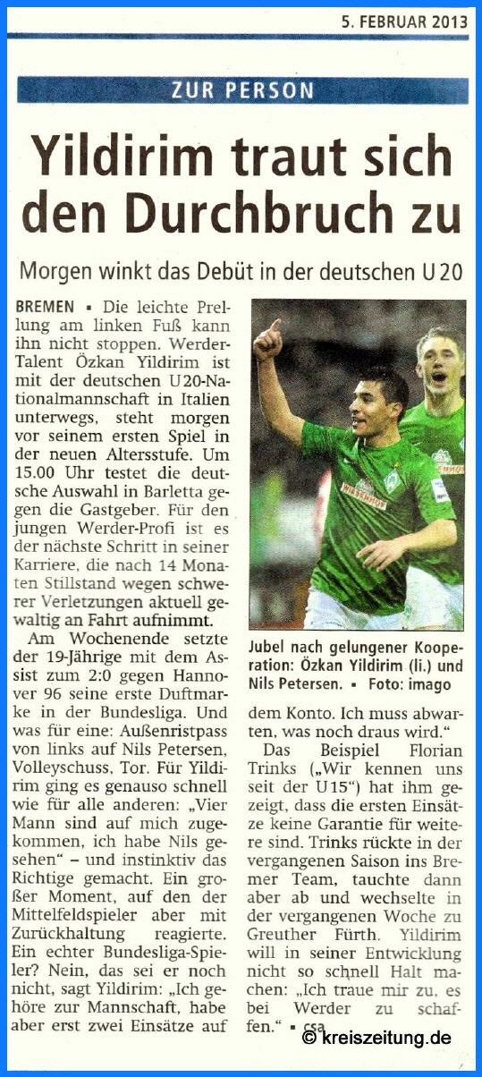 Der Sulinger Özkan Yildirim erfüllt sich seinen Traum. Bundesligadebüt am 19. Januar 2013 gegen den Deutschen Meister Borussia Dortmund. Özkan wurde am 10. April 1993 in Sulingen (www.sulingen.de) geboren. Dort begann er auch beim hiesigen TUS Sulingen (www.tus-sulingen.de) seine Fußballkarriere. Doch schon schnell wurde man auf das außergewöhnliche Talent von Özkan Yildirim aufmerksam. So wechselte er bereits als 10-jähriger im Sommer 2003 in die U11 des SV Werder Bremen. Nach der Beendigung der Realschule in Sulingen im Jahre 2009 siedelte Özkan dann ins Werder Internat über. Im August 2008 wurde er in die deutsche U16 Nationalmannschaft unter Trainer Stefan Böger berufen. In der Saison 2009/2010 wurde er von Trainer Victor Skripnik zum Kapitän der Bremer B-Junioren Bundesliga Mannschaft ernannt. Große Erfolge erzielte Yildirim auch unter Trainer Mirko Votava bei den A-Junioren des SV Werder. In der Saison 2010/2011 wurde er dann von Trainer Horst Hrubesch zum Kapitän der deutschen U18 Nationalmannschaft berufen. Eine Verletzung im 2. Profitraining vor der Saison 2011/2012 stoppte jäh die Karriere von Özkan Yildirim. Erst nach fast 18 - monatiger Spielpause kam es am 4. Dezember 2012 zum Pflichtspielcomeback mit Werder Bremen II beim TSV Havelse. Nach toller Vorbereitung im Trainingslager in der Türkei im Januar 2013 wurde Yildirim am 19. Januar 2013 von Trainer Thomas Schaaf mit dem Bundesligadebüt gegen den Deutschen Meister Borussia Dortmund belohnt.Am 30. Januar 2013 wurde Özkan Yildirim erstmals von Trainer Frank Wormuth für die deutsche U20 Nationalmannschaft für das Länderspiel am 6. Februar 2013 gegen Italien in Barletta nominiert. Am 1. Februar gelang Özkan im 2. Bundesligaeinsatz eine Vorlage der Kategorie: " Boah ey ... " . Das anschließende Tor von Nils Petersen ist ein heißer Kandidat für den Titel: " Tor des Monats Februar 2013 ". Hier gehts zum Video von SkySport HD.