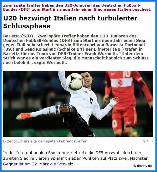 Zum Bericht auf dtoday auf die Grafik klicken Zweiter 2:0 Sieg für Özkan Yildirim in Folge. Nach dem 2:0 Sieg am letzten Freitag in der Bundesliga gegen Hannover 96 nun ein 2:0 mit Deutschlands U20 gegen Italien. So kann es weitergehen ... Ziel am Samstag: Der VfB Stuttgart.