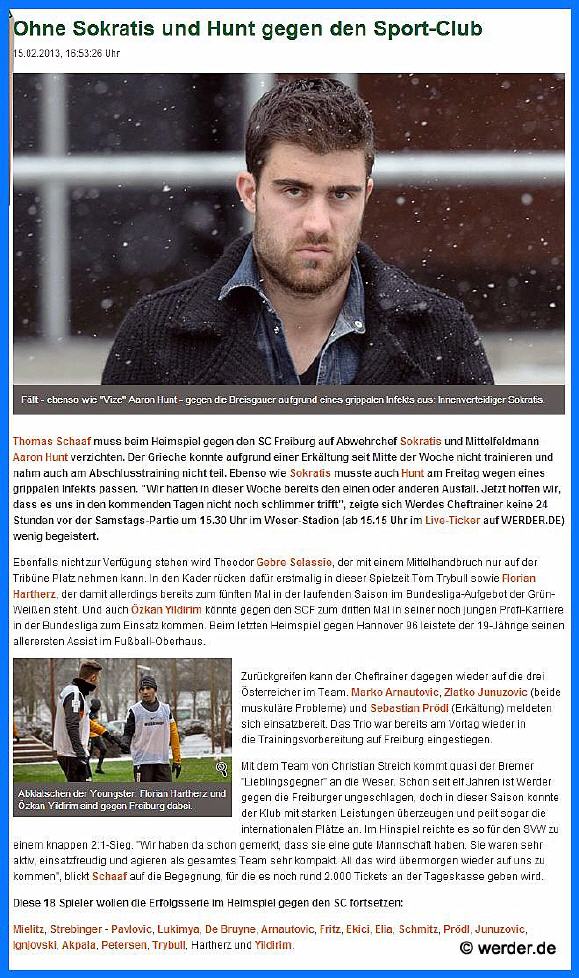 Zu Werder.de auf die Grafik klicken Özkan Yildirim ist zum 4. Mal im Bundesligakader von Werder Bremen. Am Samstag, den 16. Februar geht es um 15.30 Uhr im Weserstadion gegen den SC Freiburg. Bei einem Sieg könnten die Bremer punktemäßig mit dem Sportclub gleichziehen.