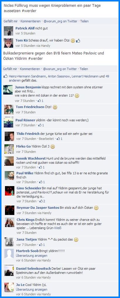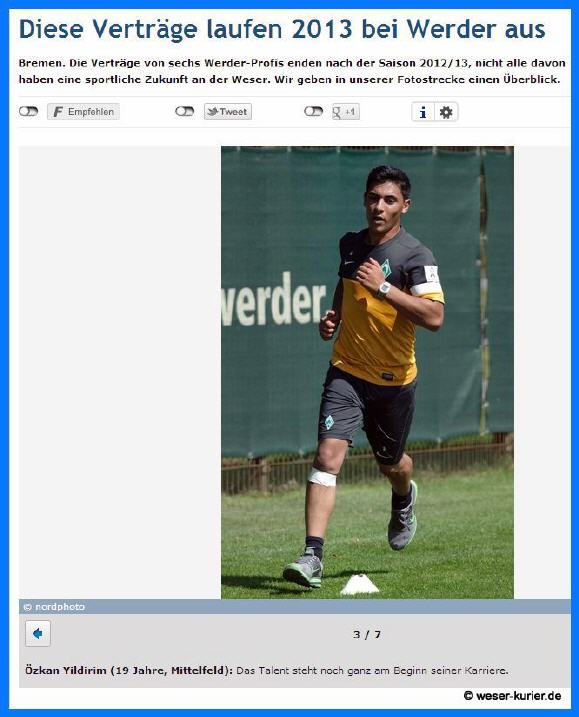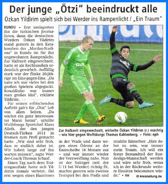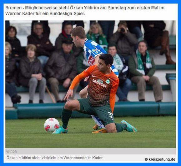 Zum Bericht auf die Grafik klicken Der Sulinger Özkan Yildirim steht nach starker Wintervorbereitung am Samstag gegen Meister Borussia Dortmund möglicherweise erstmals im Bundesligakader vom SV Werder Bremen. Hieß es früher einmal in Bremen " Mach et, Otze " (Frank Ordenewitz), heißt es nun in Zukunft vielleicht " Mach et, Ötzi " . Alle Bremer Fans sind gespannt und stehen wie das ganze Sulinger Land geschlossen hinter Özkan. Viel Glück und Erfolg !!!