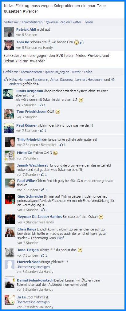 Der Sulinger Özkan Yildirim erfüllt sich seinen Traum. Bundesligadebüt am 19. Januar 2013 gegen den Deutschen Meister Borussia Dortmund. Özkan wurde am 10. April 1993 in Sulingen (www.sulingen.de) geboren. Dort begann er auch beim hiesigen TUS Sulingen (www.tus-sulingen.de) seine Fußballkarriere. Doch schon schnell wurde man auf das außergewöhnliche Talent von Özkan Yildirim aufmerksam. So wechselte er bereits als 10-jähriger im Sommer 2003 in die U11 des SV Werder Bremen. Nach der Beendigung der Realschule in Sulingen im Jahre 2009 siedelte Özkan dann ins Werder Internat über. Im August 2008 wurde er in die deutsche U16 Nationalmannschaft unter Trainer Stefan Böger berufen. In der Saison 2009/2010 wurde er von Trainer Victor Skripnik zum Kapitän der Bremer B-Junioren Bundesliga Mannschaft ernannt. Große Erfolge erzielte Yildirim auch unter Trainer Mirko Votava bei den A-Junioren des SV Werder. In der Saison 2010/2011 wurde er dann von Trainer Horst Hrubesch zum Kapitän der deutschen U18 Nationalmannschaft berufen. Eine Verletzung im 2. Profitraining vor der Saison 2011/2012 stoppte jäh die Karriere von Özkan Yildirim. Erst nach fast 18 - monatiger Spielpause kam es am 4. Dezember 2012 zum Pflichtspielcomeback mit Werder Bremen II beim TSV Havelse. Nach toller Vorbereitung im Trainingslager in der Türkei im Januar 2013 wurde Yildirim am 19. Januar 2013 von Trainer Thomas Schaaf mit dem Bundesligadebüt gegen den Deutschen Meister Borussia Dortmund belohnt.Am 30. Januar 2013 wurde Özkan Yildirim erstmals von Trainer Frank Wormuth für die deutsche U20 Nationalmannschaft für das Länderspiel am 6. Februar 2013 gegen Italien in Barletta nominiert. Am 1. Februar gelang Özkan im 2. Bundesligaeinsatz eine Vorlage der Kategorie: " Boah ey ... " . Das anschließende Tor von Nils Petersen ist ein heißer Kandidat für den Titel: " Tor des Monats Februar 2013 ". Hier gehts zum Video von SkySport HD.