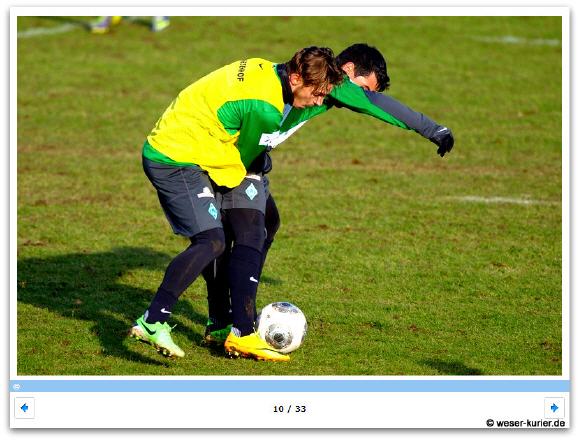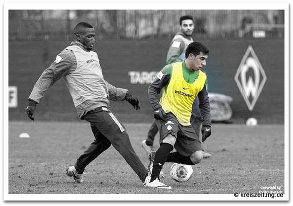Zur Fotostrecke auf die Grafik klicken Werder Neuzugang Ludovic Obraniak machte am Dienstag, 4. Februar beim Werder-Training einen sehr guten Eindruck. Hier im Zweikampf um den Ball mit Özkan Yildirim.